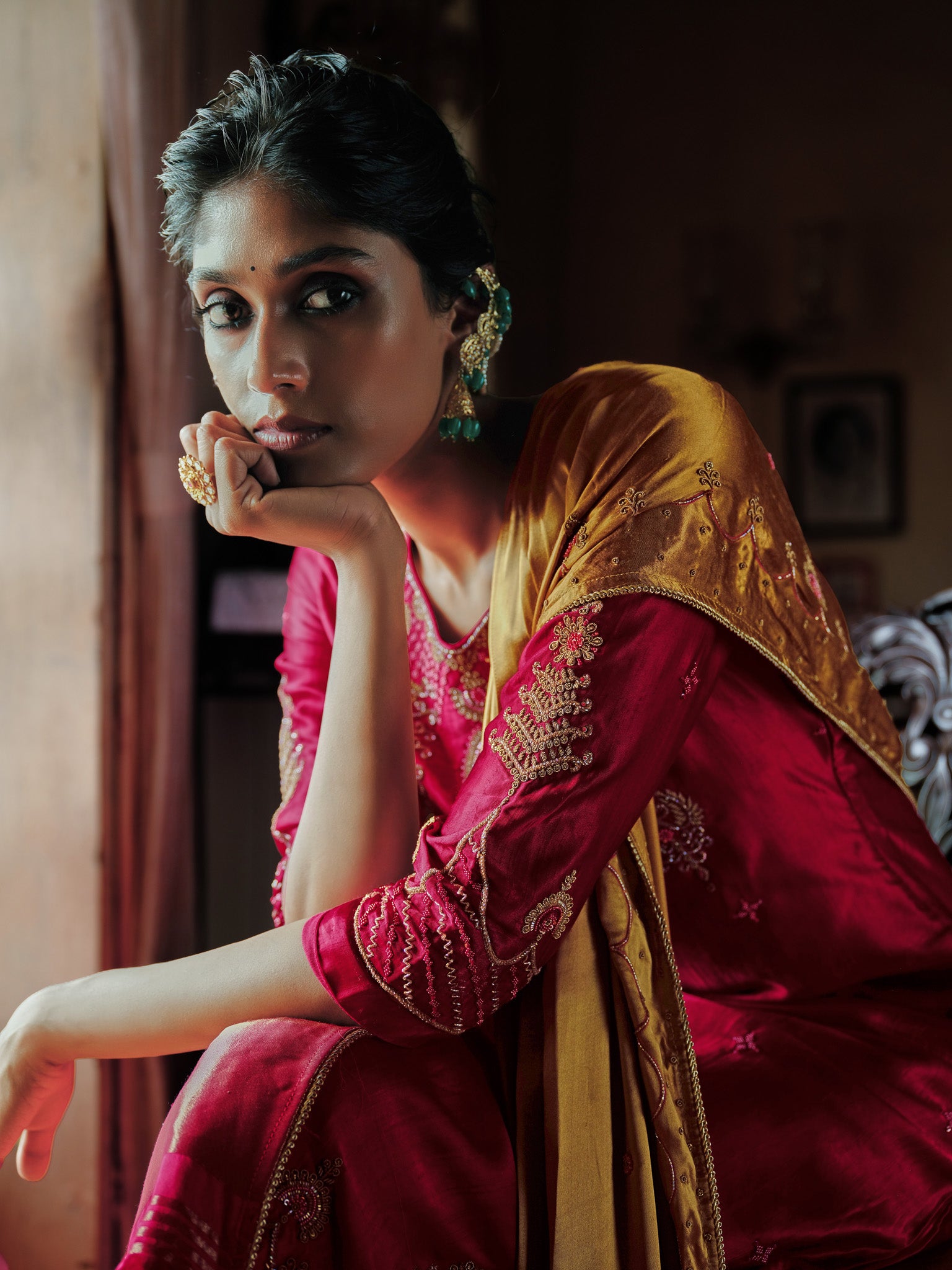 Dabka and Sadi threads, accented with Catdana, Poth work, and ornate Zardozi detailing